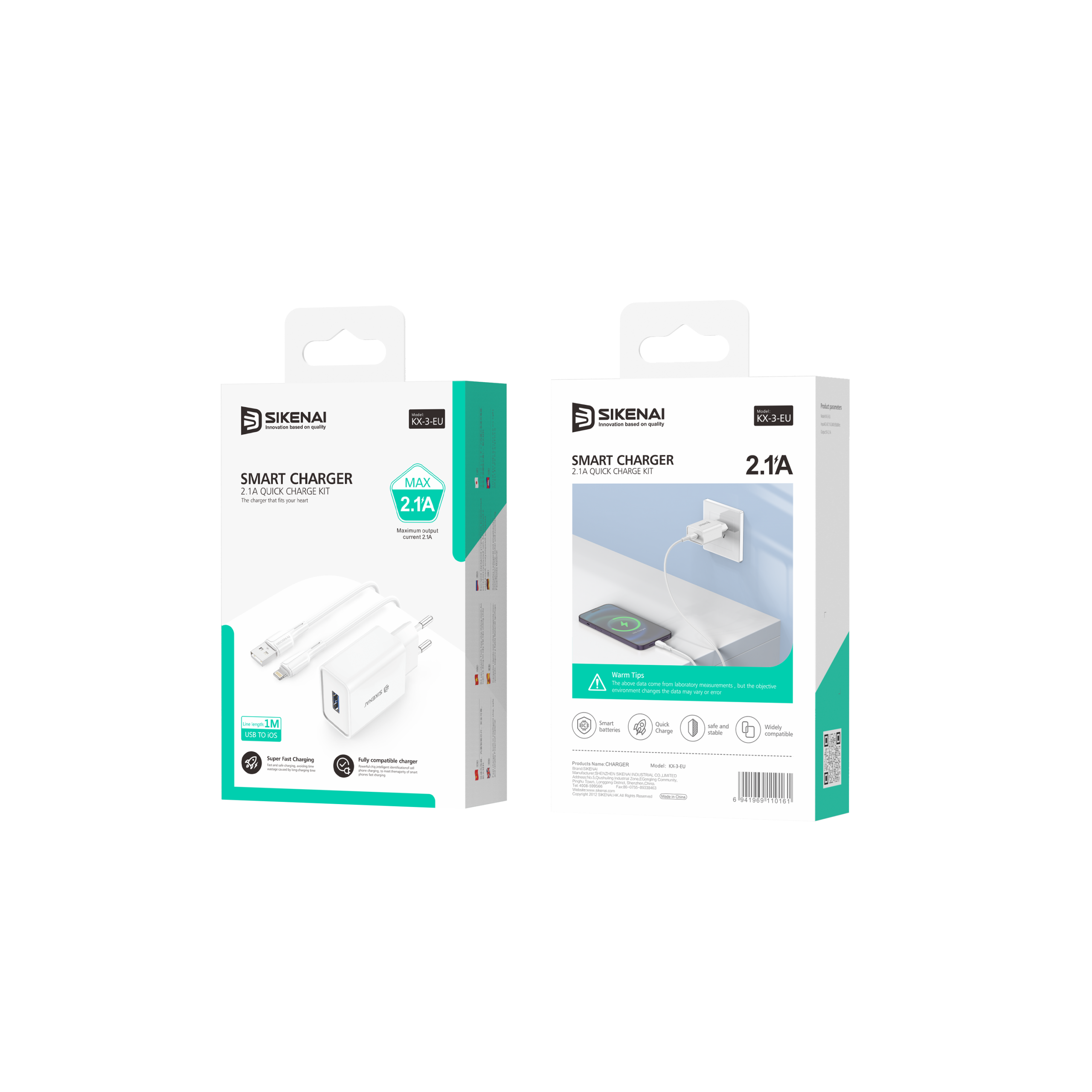 מטען SIKENAI KX-3LEU עם זרם יציאה של 2.1A (בערך 10–11 וואט ב־5V), מגיע עם כבל Lightning כלול באורך שלרוב כ־1 מטר. פועל במתח כניסה עולמי 110–240V, ומיוצר ממבנה עמיד באש עם חומרי ABS + PC. מספק טעינה יציבה ובטוחה למכשירי iPhone, וכולל הגנות מפני מתח יתר, זרם יתר וחום. נפוץ בשימוש יומיומי למכשירי אפל.
